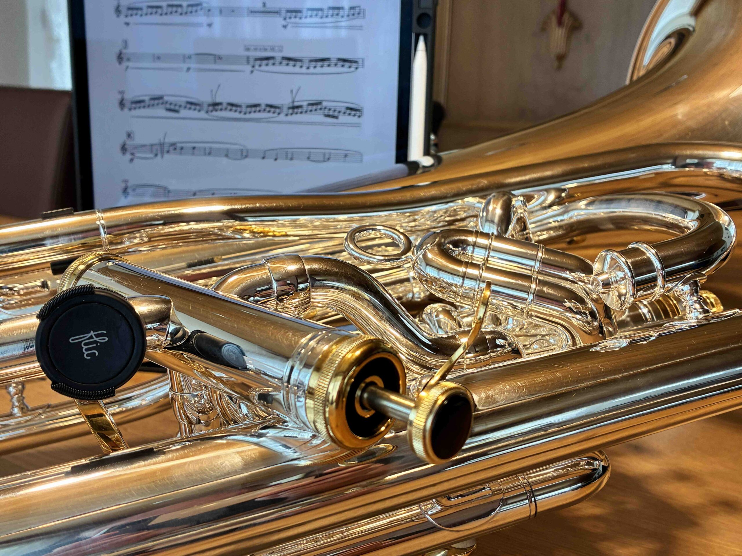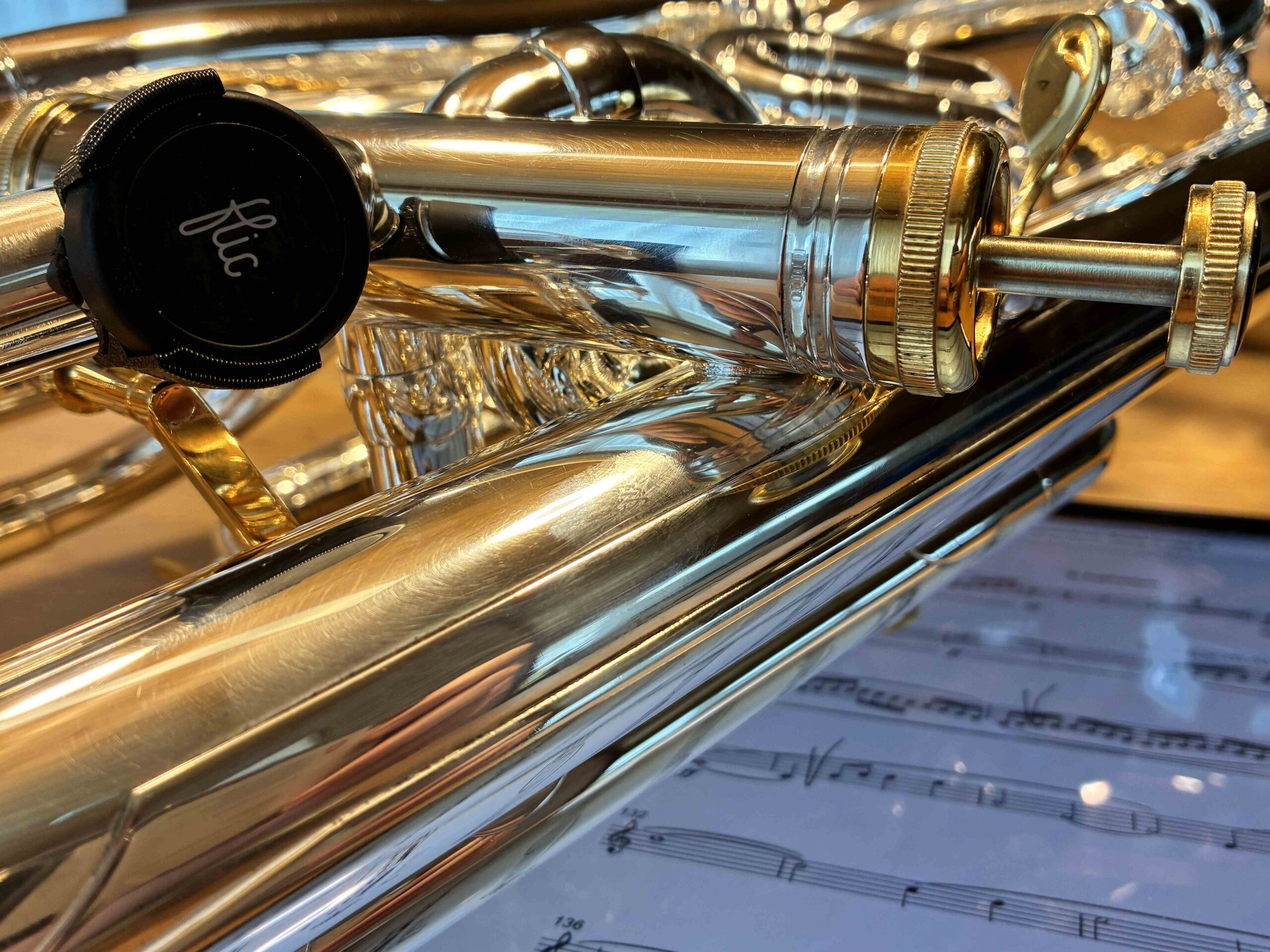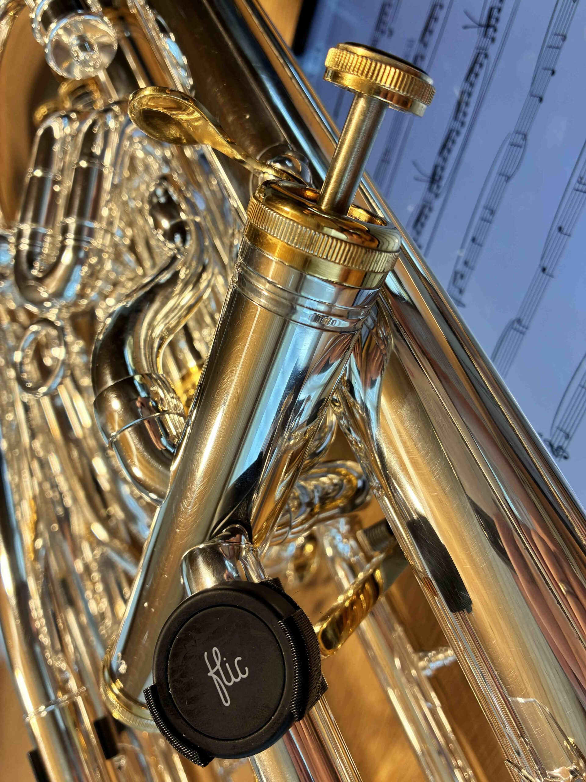 SlideClick Universal ist die innovative Lösung, um deinen Flic Button sicher und flexibel an deinem Instrument zu befestigen. Egal ob Posaune, Trompete, Horn oder Notenständer: Du behältst die volle Kontrolle über deine digitalen Anwendungen, ohne jemals die Hände vom Instrument nehmen zu müssen.